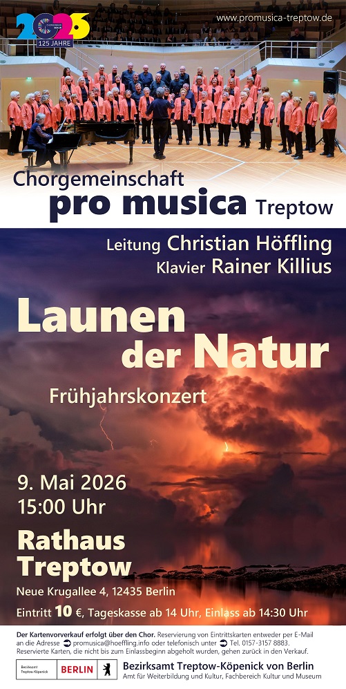 Nichts für Senioren, meinen Sie? Dann hören Sie selbst und kommen am 9.5. ins Rathaus Treptow. Unter der Leitung unseres Chorleiters Christian Höffling präsentiert der Chor zum einen klassisches Frühlingsrepertoire – von einschlägigen Volksliedern über Mendelssohns „Nachtigall“ bis zum Filmschlager „Cuculino“, den Vico Torriani 1954 in „Gitarren der Liebe“ sang.